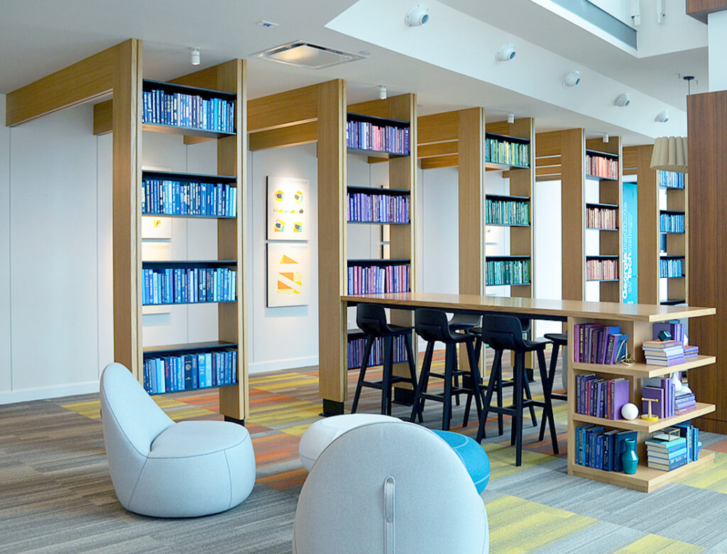 We worked with artist Stacie Rose to develop this supersized mural for Coda in Midtown Atlanta. The fully abstract mural on concrete splashes juicy color and texture across three stories, an unexpected flourish across the beautifully designed lounges. Viewed from afar, the broad compositional strokes are apparent. The up-close viewer gets an entirely different experience of delicate patterns and textures, in an unusual palette derived from the architectural and furniture finishes.