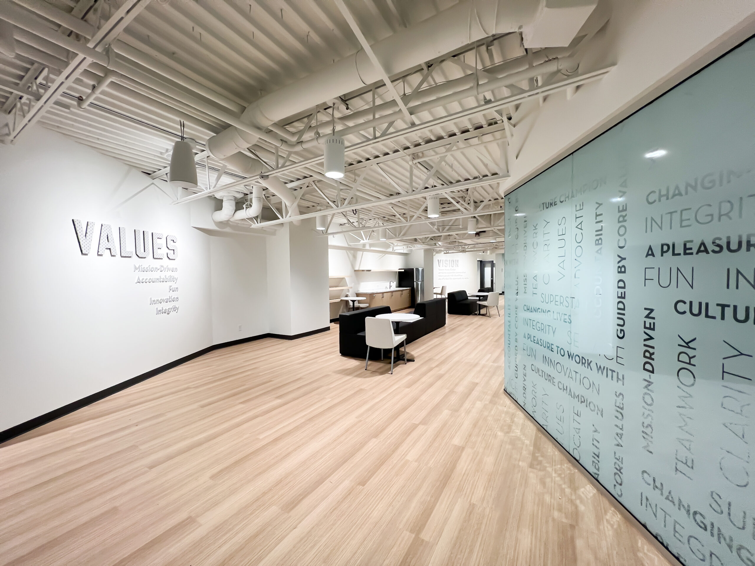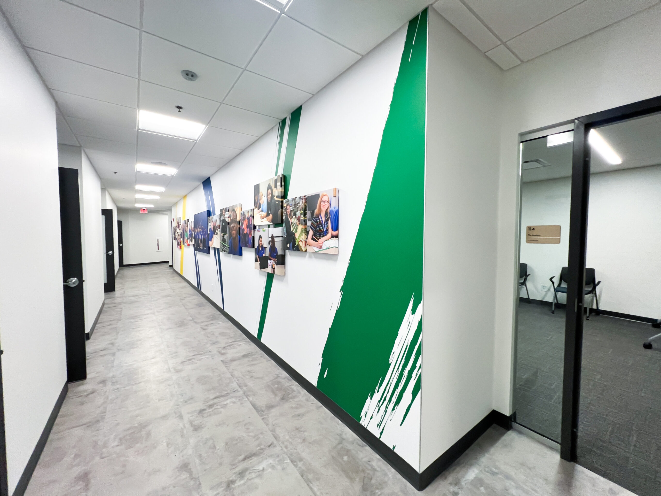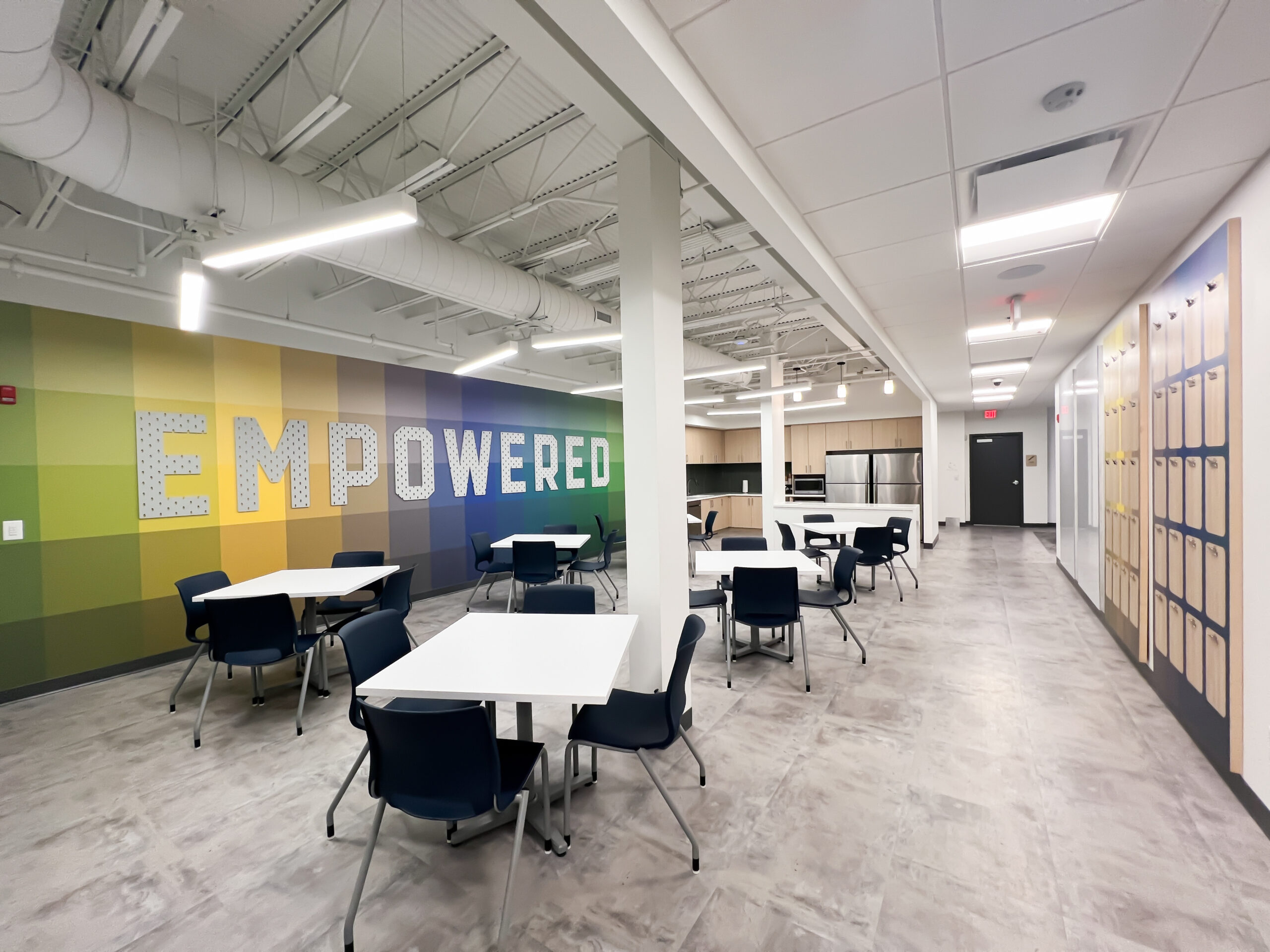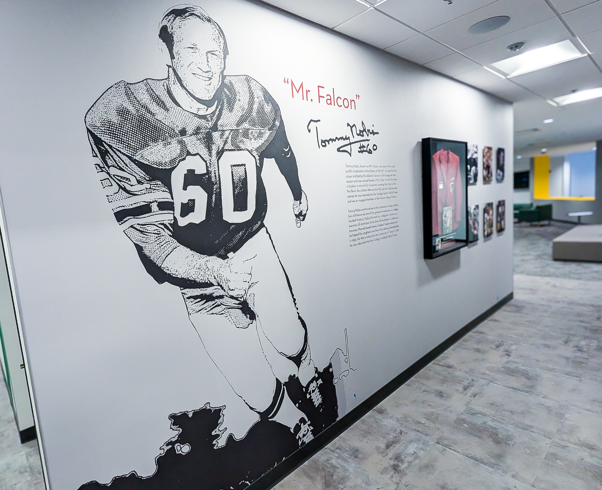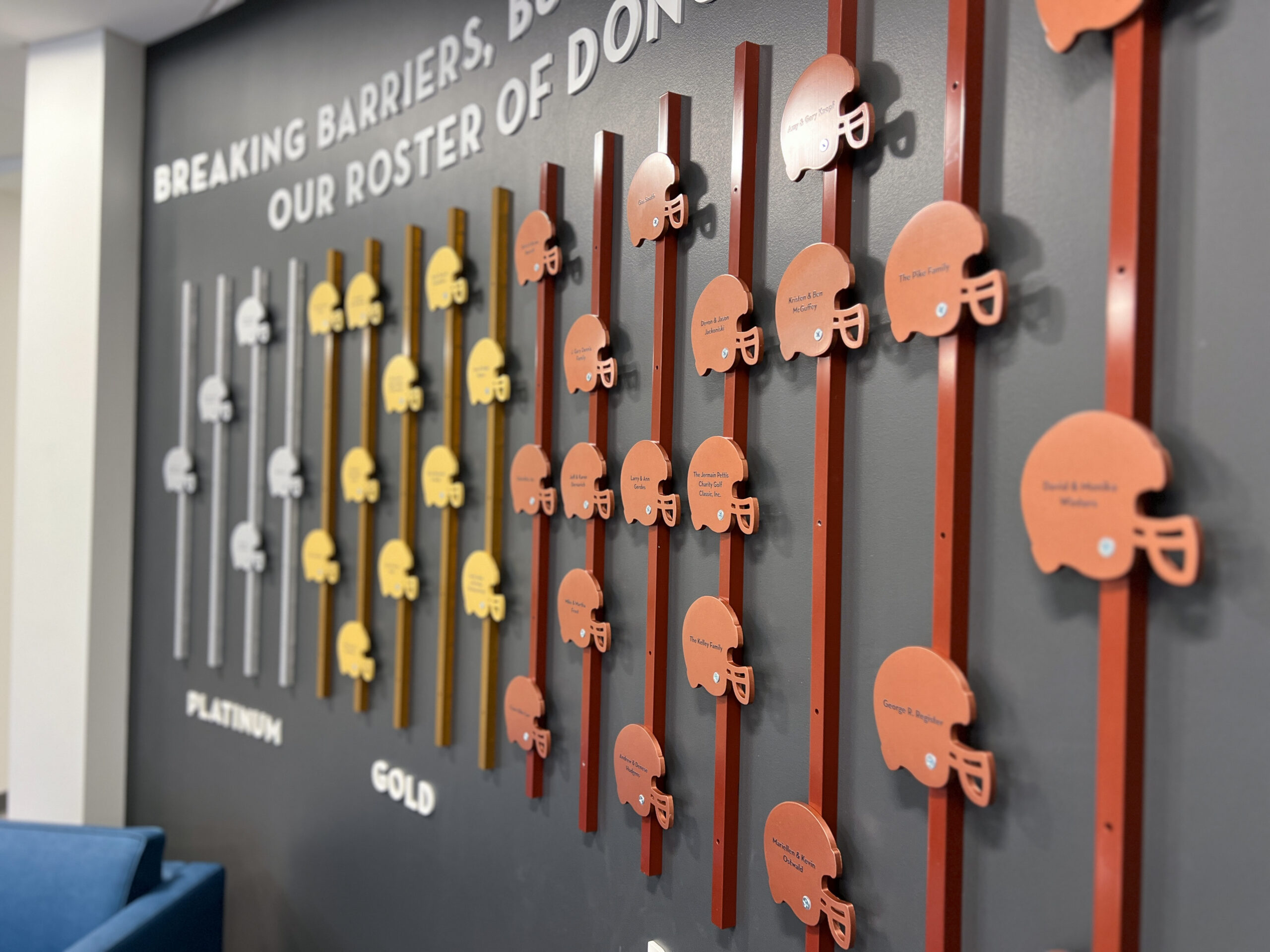 Our environmental graphics and displays for Tommy Nobis Center drew from the design language of collegiate athletics, underscoring the organization’s inspirational and teamwork-driven mission of job training for people living with disabilities. The history of their namesake founder is featured in storytelling displays, utilizing a mix of dimensional materials and artifact exhibits. The energized environment emphasizes the people and community they serve, featuring real students who have benefitted from the nonprofit’s mission to help people with disabilities find self-sufficiency with personalized job coaching.
